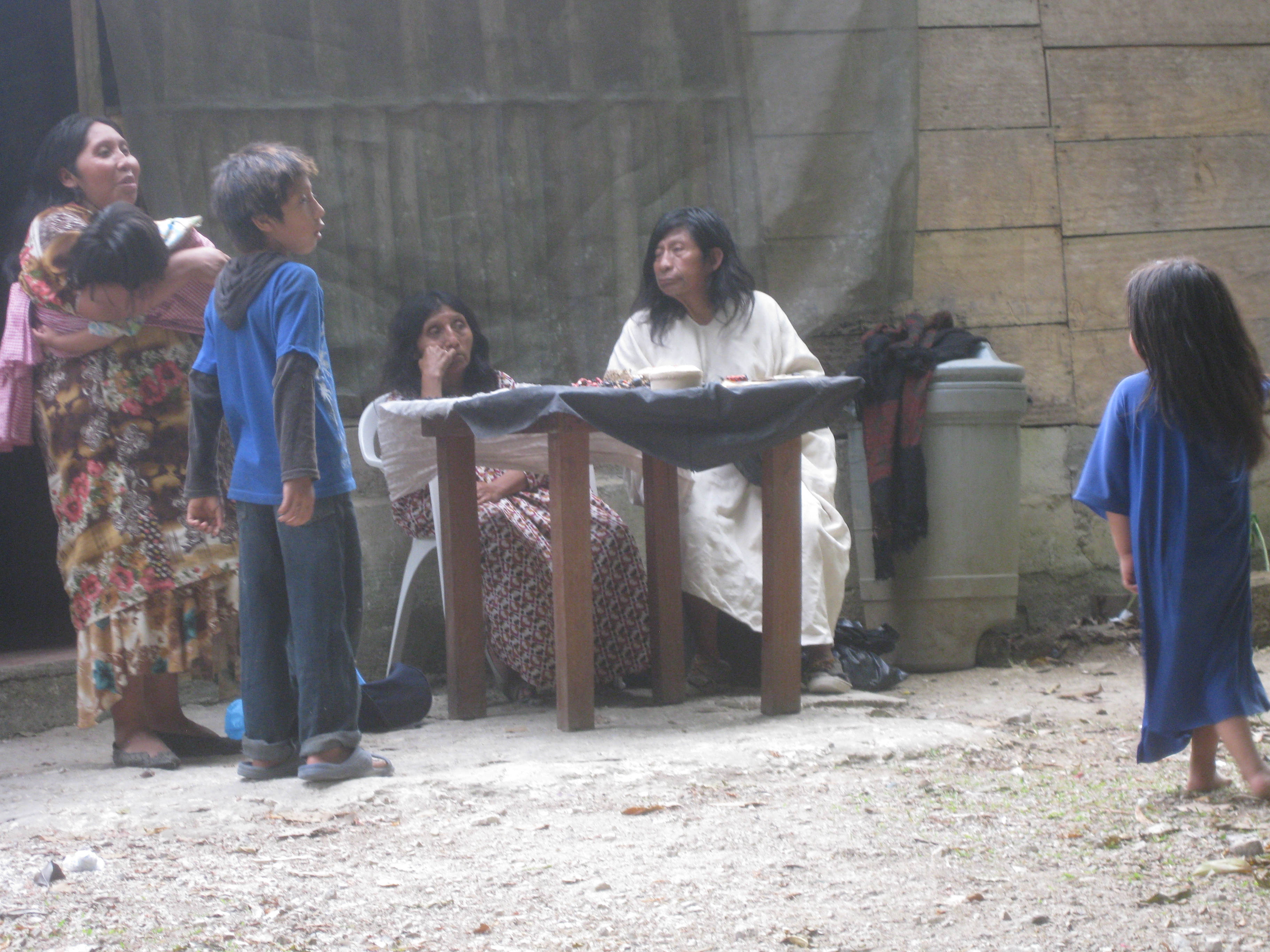 We ate a decent dinner and then walked along the one-block main street, where a fería was happening. The fería entailed about four tables covered with handicrafts, mostly bead necklaces and bracelets, with forlorn women sitting behind them in the absolute absence of customers. Many people sat on a big platform watching a movie projected onto a screen. The movie was well along when I joined the audience, but its theme soon became apparent. It was a Lacondon doomsday documentary, about how the people have abandoned traditions and the forest. About how they have allowed all the trees to be cut down, and about the abandonment of community by Lacondon youth.